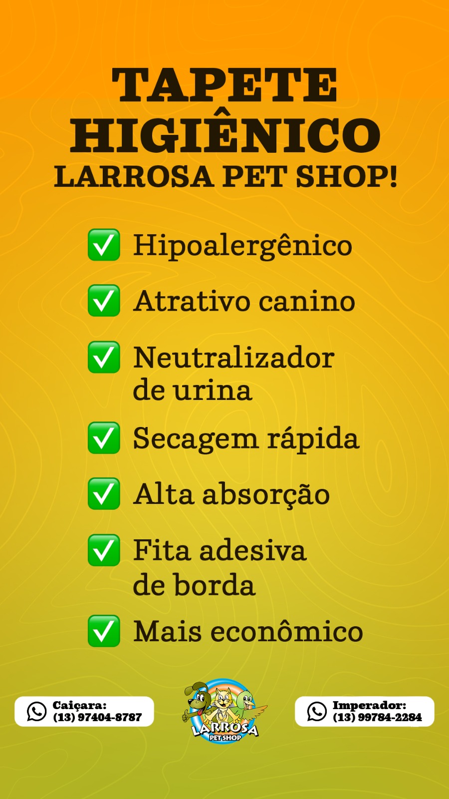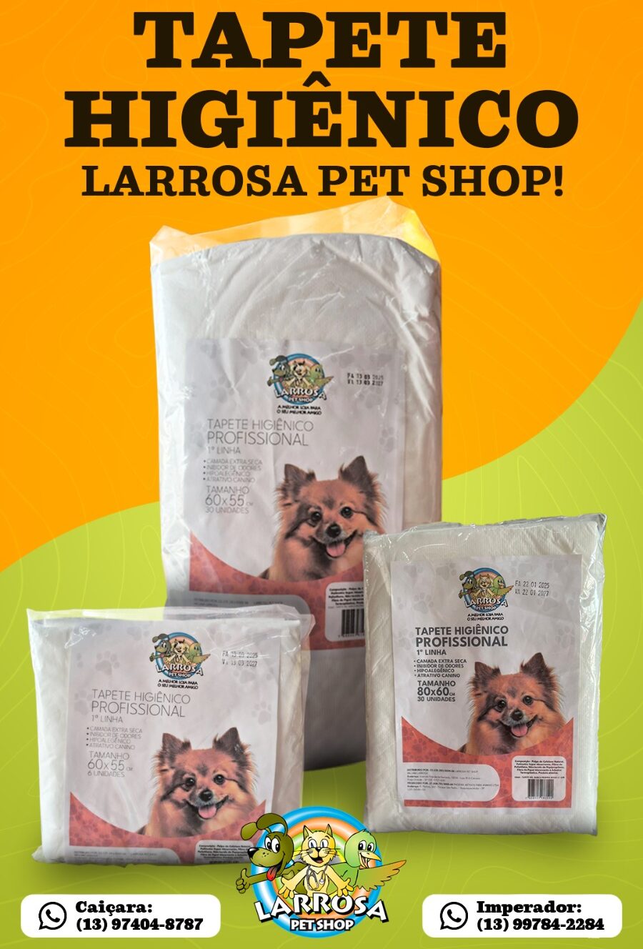 Os tapetes higiênicos Larrosa Pet Shop foram desenvolvidos pensando no conforto do seu pet e na praticidade do seu dia a dia!